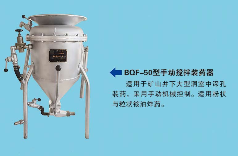 BQF-50 型抬杠式有攪拌裝藥器,適用于礦山井下大型洞室中深孔裝藥,采用手動(dòng)機(jī)械控制。適用粉狀與粒狀銨 *油 *炸* 藥。