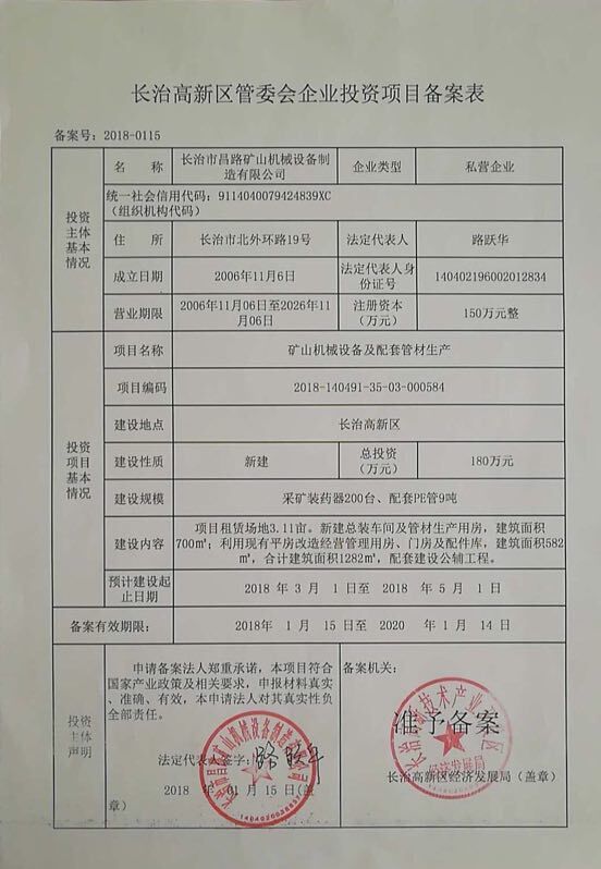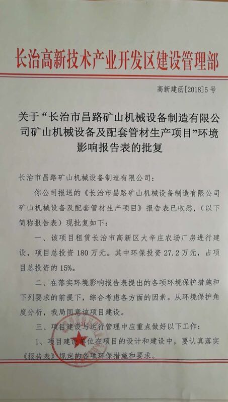 關于“長治市昌路礦山機械設備制造有限公司礦山機械設備及配套管材生產(chǎn)項目”環(huán)境影響報告表的批復